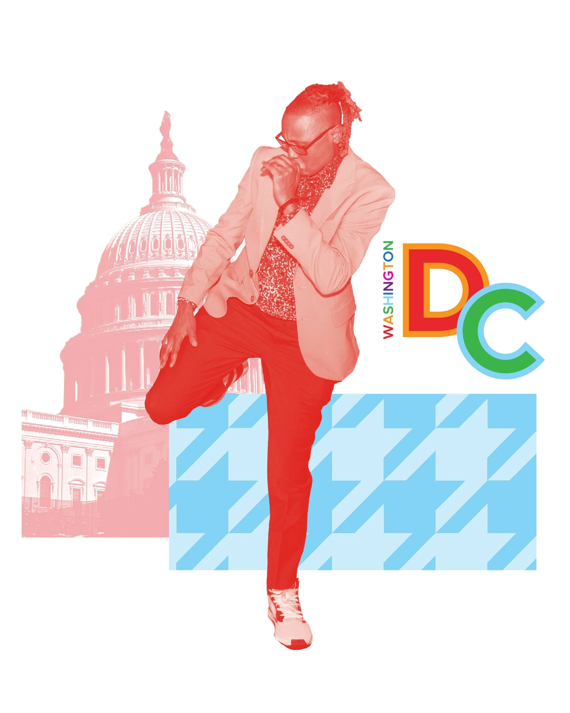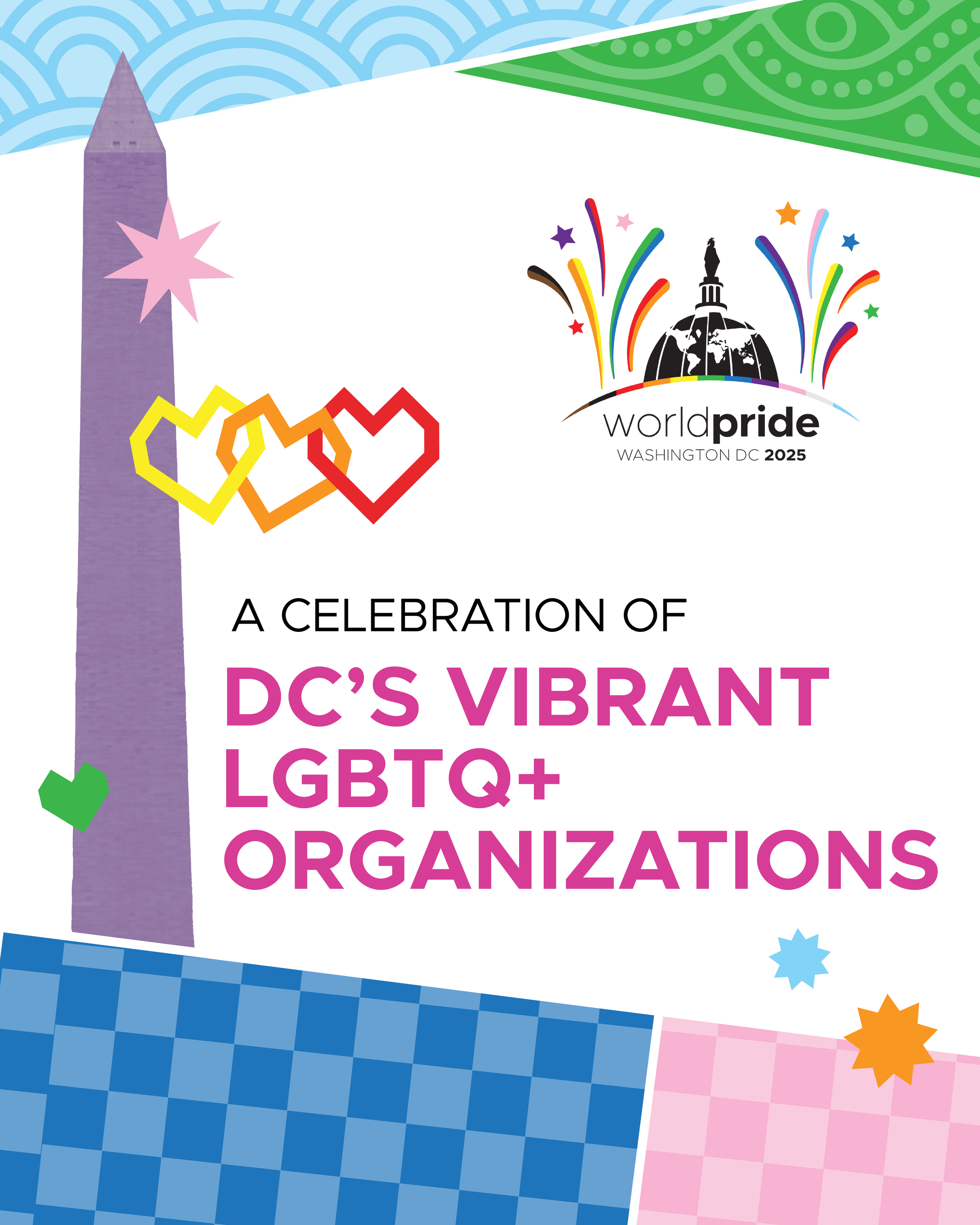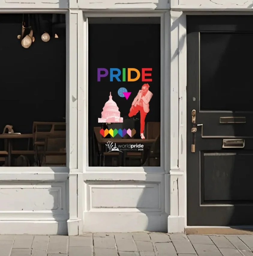 I designed a series of window clings available for purchase for small DC businesses sponsoring WorldPride 2025. The clings consist of a series of collaged images that combined images of past Pride celebration-goers with icons of DC and the patterns that were part of the brand identity of WorldPride 2025. I created a series of large, pre-constructed collaged images as well as smaller visual components that could accompany the larger images. These smaller illustrated elements were also applied to other materials for the event including merch, social media posts, environmental graphics and marketing collateral.